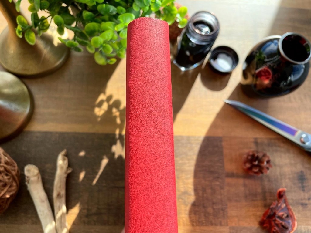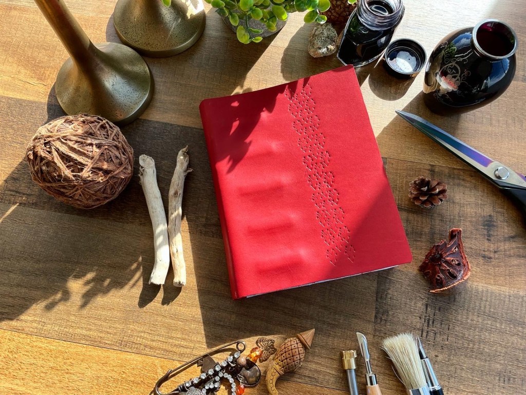 I made a leather journal recently – this one is a hefty 256 pages! It’s covered using a cherry red colored piece of veg tanned leather. I’ve added a strip of saddle shaped leather stamps on the cover. I think it looks pretty! 🙂