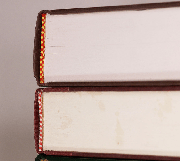 An endband, more so the headband, helps to resist the strain placed on the book when shelved upright with the spine facing outward, especially as it is common to pull a book out by hooking a finger over the top edge of the spine. Endbands were traditionally made from small pieces of vellum, catgut, or cord wrapped or braided with silk; though today they are separately manufactured ribbons. The endband is tightly sewn to the sections of the book where it can support the weight of the pages. When endbands are used for decorative purposes they may only be glued in place rather than sewn, though at a loss of reinforcing strength.”