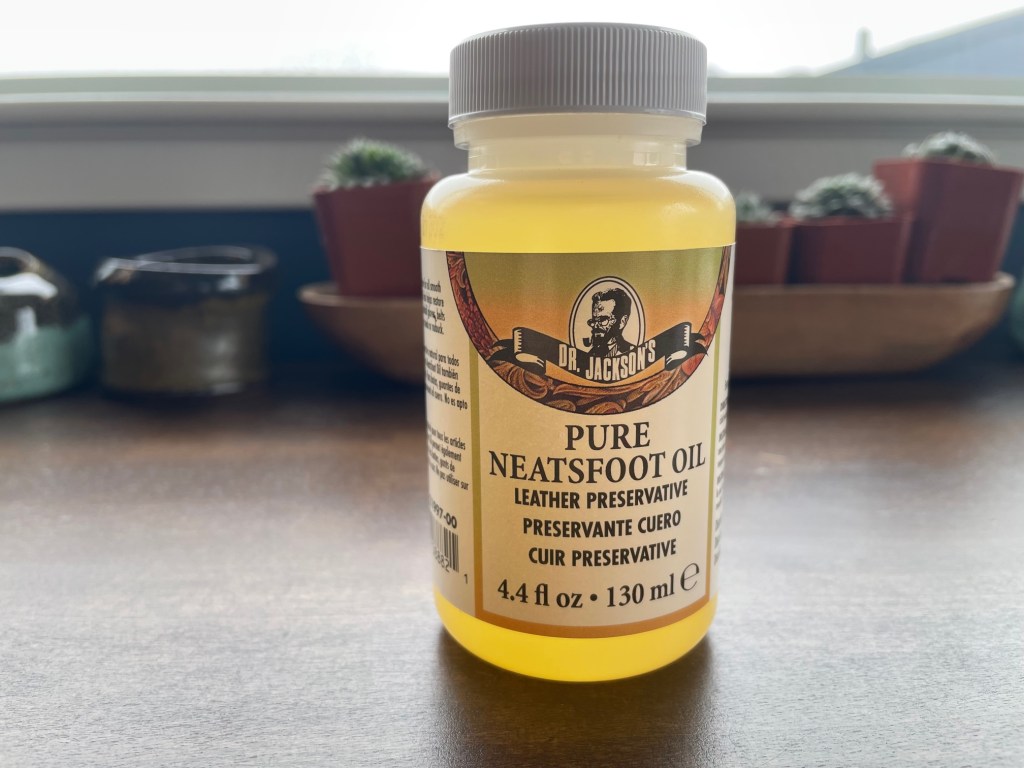 One of the things that he introduced me to, is what is called “Neatsfoot Oil“. I’d asked him for what could I do to make leather feel more “polished” and “supple”, and he suggested Neatsfoot oil, as a way to increase the life of your leather, and make sure that it doesn’t dry out. Quoting from Wikipedia –