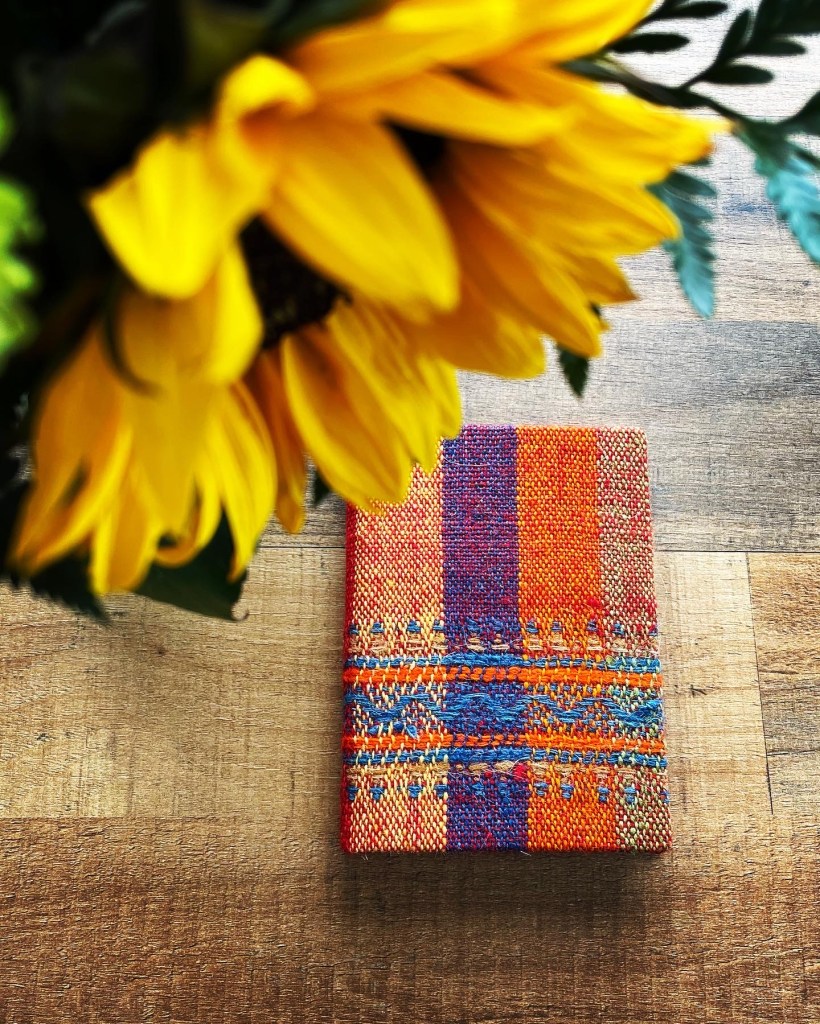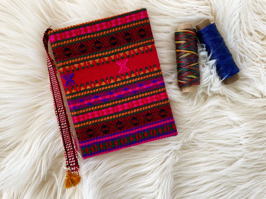 On a recent visit to the Rann of Kutch in Gujarat, India, I discovered these colorful woolen shawls, handmade and handwoven by the local artisans. You cannot help but admire the colors and mirror work! I bought a few of these. My mind immediately turned to whether I could use the material to bind books. And yes – that’s what I did! 🙂